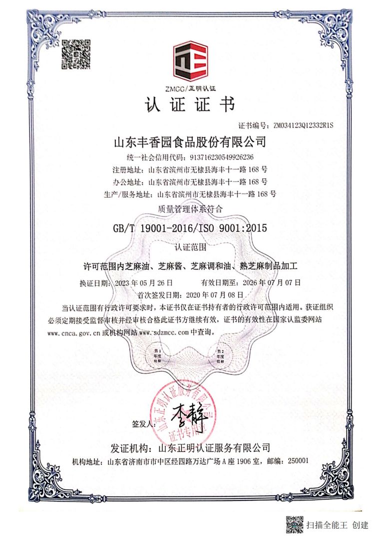 ? ? 豐香園小磨香油、芝麻調(diào)和油、花生醬、芝麻醬、混合醬、熟芝麻制品均已通過英國零售商協(xié)會BRC認(rèn)證、歐盟 美國和國內(nèi)有機、HACCP體系認(rèn)證,是山東省出口食品備案企業(yè)。